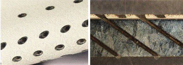 英國(guó)溫伯樂公司(Winbro)采用激光打孔技術(shù)對(duì)不同涂敷厚度的熱障涂層進(jìn)行了不同角度激光打孔試驗(yàn)。通過(guò)優(yōu)化激光打孔和涂層涂覆工藝參數(shù)可以避免陶瓷面層分層和粘結(jié)層/高溫合金基體界面裂紋的產(chǎn)生。圖5為打孔后的熱障涂層表面和截面形貌照片。該工藝采用的GUI控制軟件可以讓每個(gè)脈沖具有不同的激光參數(shù)。在陶瓷面層打孔時(shí)使用正確的峰值功率/脈沖能量組合以降低激光束能量對(duì)界面的熱損傷,當(dāng)打到基體時(shí)應(yīng)采用足夠高的峰值功率,以便在很短的時(shí)間內(nèi)完成打孔,減少氣膜孔孔徑內(nèi)重熔層的產(chǎn)生。據(jù)了解,Winbro公司對(duì)燃燒室涂層(基體2mm厚,涂層0.35mm厚)進(jìn)行20°、0.52mm直徑氣膜孔加工時(shí),重熔層平均厚度為20μm TBC;對(duì)渦輪葉片涂層(基體3mm厚,涂層0.65mm厚)進(jìn)行30°、0.65mm直徑氣膜孔加工時(shí),重熔層平均厚度為29μm 。