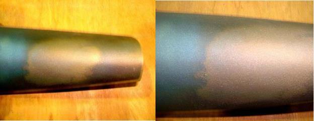 對(duì)于金屬粘結(jié)底層主要采用化學(xué)法和高能粒子轟擊法去除。涂層的去除程度可以通過(guò)熱著色方法判斷。先用120~250目沿葉型方向以較小的壓力在葉片表面吹砂,然后將清潔的葉片置入空氣循環(huán)爐內(nèi)加熱到510~590℃保溫1h,空冷,目視檢驗(yàn)葉片顏色。藍(lán)色表示涂層已完全去除,稻草色或金黃色表示涂層未完全去除(如圖10所示)。