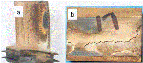 圖1  不帶陶瓷涂層葉片(左)和帶熱障陶瓷涂層葉片(右)服役后表面狀態(tài)對(duì)比