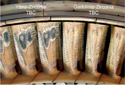 國(guó)內(nèi)外針對(duì)CMAS的防護(hù)進(jìn)行了大量的研究,主要有以下幾個(gè)方面,一是阻止CMAS熔化后的滲入(在表層的粘附往往有滲透的現(xiàn)象,可以形成致密層,阻止CMAS的滲入),二是阻止?jié)B入后引起的氧化鋯晶型轉(zhuǎn)變(一些促進(jìn)形核的物質(zhì),或者使CMAS產(chǎn)生結(jié)晶,如產(chǎn)生氧化鋁晶體和尖晶石相,不再滲透等),三是阻止在陶瓷層的上部(滲入?yún)^(qū)域)產(chǎn)生壓縮、致密層效果(極易產(chǎn)生很大的應(yīng)力和熱不匹配,是引起失效剝落的主要因素之一)等。美國(guó)Pratt & Whitney Aircraft公司通過(guò)對(duì)比傳統(tǒng)YSZ熱障涂層與新型PWA 36309GdxZr1-xO2-x/2熱障涂層在X47的試車結(jié)果表明(如圖7所示),新型GdxZr1-xO2-x/2熱障涂層具有良好的抗CMAS腐蝕性能。