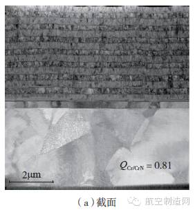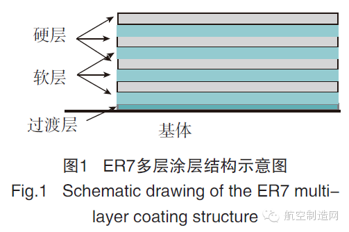 目前,國(guó)外主要將二元抗沖蝕涂層用于航空發(fā)動(dòng)機(jī)上,如法國(guó)幻影戰(zhàn)機(jī)一、二級(jí)壓氣機(jī)葉片使用TiN 涂層,前蘇聯(lián)也使用TiN、CrC、ZrN 涂層葉片,尤其將TiN 涂層應(yīng)用于米-24、米-28 直升發(fā)動(dòng)機(jī)引擎螺旋槳及壓氣機(jī)轉(zhuǎn)子葉片上。美國(guó)則將TiN 涂層用于CH-46E 海上騎士運(yùn)輸直升機(jī)的引擎螺旋槳葉片,使葉片壽命提高了3~4 倍,英國(guó)也通過研究將耐沖蝕涂層用在“山貓”直升機(jī)壓氣機(jī)葉片上。MDS-PRAD、GE 公司進(jìn)一步改進(jìn)抗沖蝕涂層,并將成分分別為TiN 和TiAlN 的ER7 和BlackGold陶瓷涂層用在直升機(jī)和運(yùn)輸機(jī)發(fā)動(dòng)機(jī)上。ER7 涂層結(jié)構(gòu)如圖1 所示,該涂層為軟/硬層交替排列結(jié)構(gòu),并以過渡層與基體結(jié)合。與單層涂層相比,ER7 具有更好的斷裂韌性和抗沖擊性能,目前已在渦軸和渦扇發(fā)動(dòng)機(jī)上得到廣泛使用。