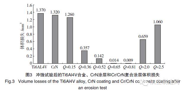 國(guó)內(nèi)外對(duì)多元合金化TiAlN、ZrAlN 等涂層、電弧鍍等技術(shù)制備的ZrN/TiN 多層納米涂層以及復(fù)合的Al/AlN、Ti/TiN、Cr/CrN 涂層等進(jìn)行了大量研究[7-9]。圖2[10] 為典型Cr/CrN交替的涂層顯微組織,這種復(fù)合方式明顯改善了涂層抗沖蝕性能。Cr/CrN 抗沖蝕性能與Cr/CrN的層厚比值Q 密切相關(guān)[10],在Q為0.81 時(shí)涂層抗沖蝕性能最佳(圖3[10])。復(fù)合涂層內(nèi)的韌性相承受較多的塑性變形,硬質(zhì)脆性相則發(fā)揮增強(qiáng)涂層抗磨損性能的作用[7]。其他研究結(jié)果說明,不只復(fù)合方式能提高耐沖蝕性能[4,11],向TiN 涂層中添加鋁的多元合金化也能增強(qiáng)涂層抗沖蝕性能[12]。